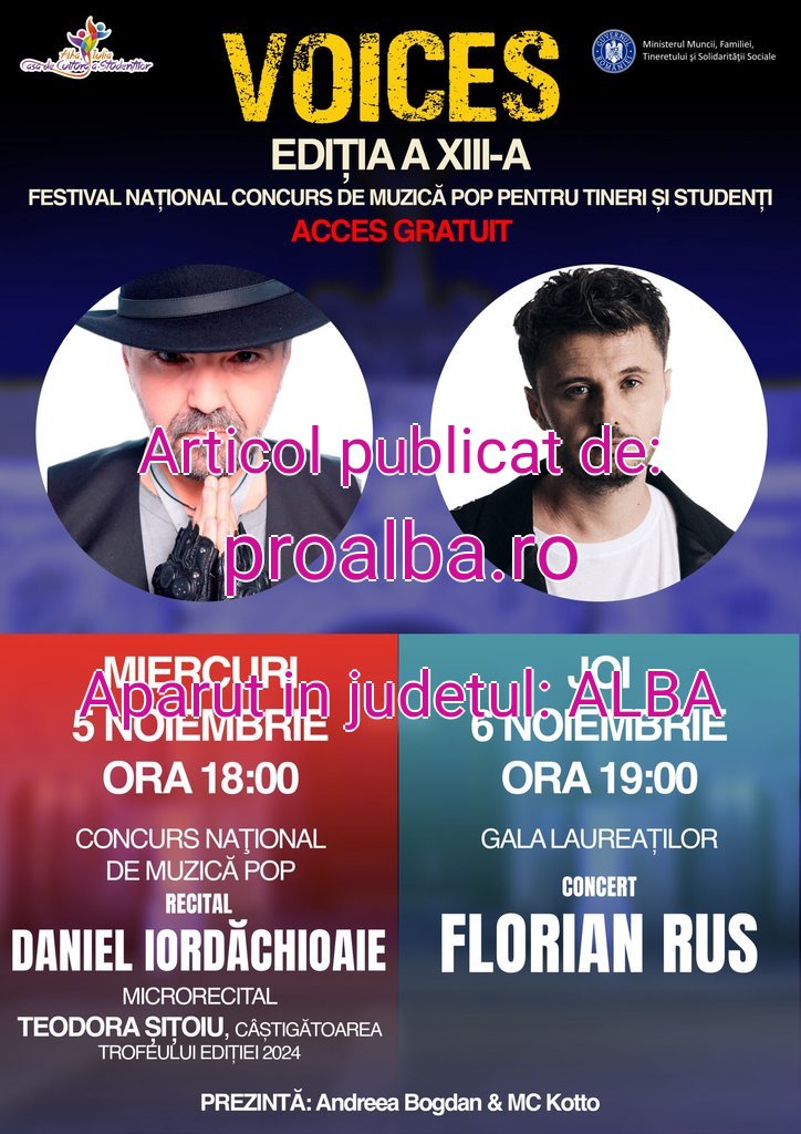 Casa de Cultură a Studenţilor Alba Iulia, cu sprijinul Ministerului Muncii, Familiei, Tineretului și Solidarității Sociale, vă invită, în perioada 5-6 noiembrie 2025, la FESTIVALUL NAŢIONAL CONCURS DE MUZICĂ POP PENTRU TINERI ȘI STUDENȚI “VOICES”, ediția a XIII-a.