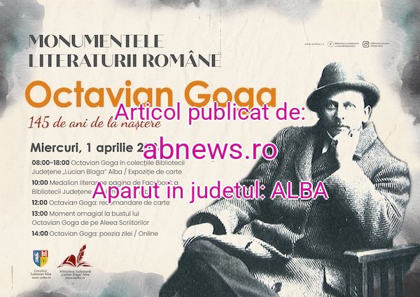 Cu prilejul împlinirii a 145 de ani de la nașterea marelui poet român Octavian Goga, Consiliul Județean Alba, Primăria Municipiului Alba Iulia, Biblioteca Județeană „Lucian Blaga” Alba, Casa de Cultură a Studenților și asociațiile și fundațiile culturale din Alba Iulia organizează, miercuri 1 aprilie 2026, de la ora 13:00, la bustul lui Octavian Goga de pe Aleea Scriitorilor, o ceremonie de depunere de coroane de flori și recitare de poezie.