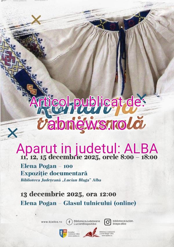 În urmă cu cincisprezece ani, la 13 decembrie 2010, se stingea din viață profesoara Elena Pogan, cea care, prin înființarea grupului de tulnicărese de la Târsa a promovat Munții Apuseni și județul Alba în toate colțurile lumii. În memoria ei, la Biblioteca Județeană „Lucian Blaga” Alba poate fi vizionată, începând de astăzi, 12 decembrie 2025, expoziția documentară „Elena Pogan la centenar”, căci anul acesta, la 20 iunie s-au împlinit o sută de ani de la nașterea sa. Expoziția cuprinde fotografii inedite din activitatea tulnicăreselor din Târsa, recuperate de pe diapozitive, pagini din presa vremii și cărți în care au apărut Elena Pogan și prețioasele sale moațe, cu tulnicele lor.