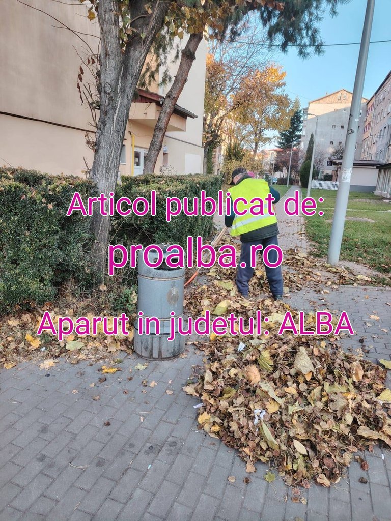 Echipele Direcției Întreținerea și Administrarea Domeniului Public și Privat au început curățenia de toamnă pe arterele principale.  Urmeză zonele verzi, aleile dintre blocuri și strazile secundare. Mulțumesc pe această cale și cetățenilor care zi de zi iși curață trotuarul din fața casei și nu au mai așteptat echipele administrației publice, a transmis, miercuri, director executiv al Direcției Întreținerea și Administrarea Domeniului Public și Privat din cadrul Primăriei Alba Iulia.