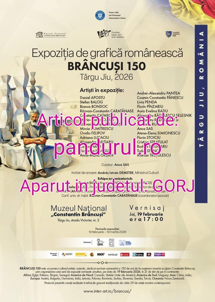 Muzeul Național „Constantin Brâncuși”, Fundația „Inter-Art” Aiud și Consiliul Județean Gorj organizează, de Ziua Națională „Constantin Brâncuși”, joi, 19 februarie 2026, la ora 17:00, vernisajul de la Târgu Jiu al Expoziției de Grafică Românească – „BRÂNCUȘI 150”.