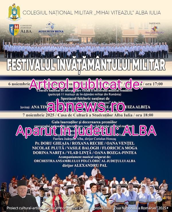 Colegiul Naţional Militar ,,Mihai Viteazul” Alba Iulia organizează în perioada 6 – 7 noiembrie 2025, prima ediție a „Festivalului Învățământului Militar”, un eveniment adresat tinerelor talente din domeniul interpretării vocale din instituțiile de învățământ militar din țară: colegii, academii și școli de maiștri și subofițeri. Festivalul face parte din calendarul manifestărilor dedicate Zilei Colegiului și este organizat în cadrul proiectului „Ziua Națională a României 2025.