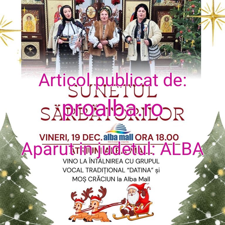 Grupul vocal „DATINA”, format din Marinela Baba, Marioara Dan Păucean și Teodora Zărnescu Craiu, vă așteaptă vineri, 19 decembrie, de la ora 18:00, la Alba Mall, pentru un concert de colinde care aduce tradiția mai aproape de suflet.